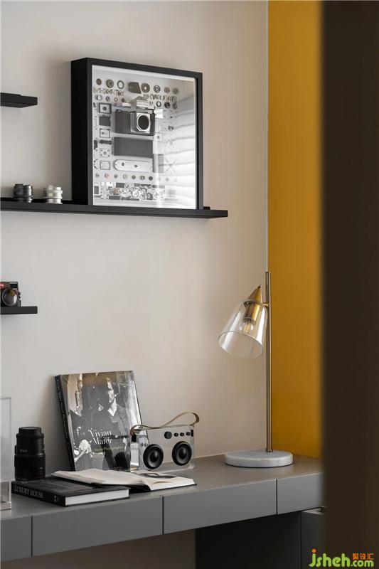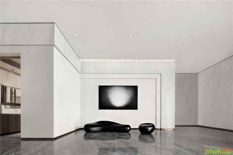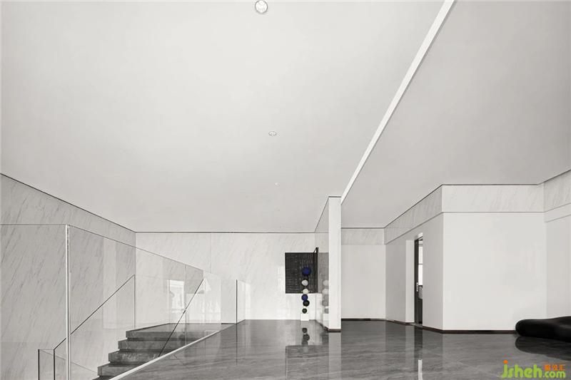 二層的休閑平臺(tái)延續(xù)樓梯的灰色色系,平直的建筑線條與球形裝飾在寂靜的空間中形成強(qiáng)烈的對(duì)比,就像是宇宙黑洞中無(wú)盡的引力,平靜卻暗藏著巨大的震撼。
