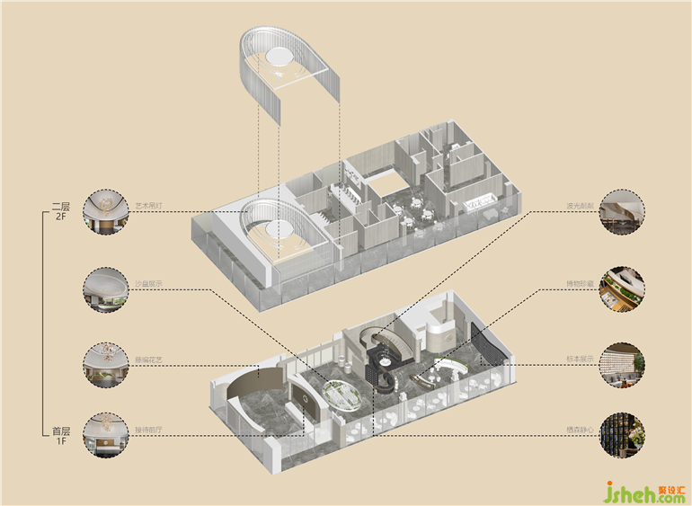 挑空下方,江西售樓處設(shè)計(jì)透過現(xiàn)代材料來呼應(yīng)生命博物館本該有的氣質(zhì),在天然石材、金屬漆面的搭配下,加以弧形墻體統(tǒng)一空間感。
