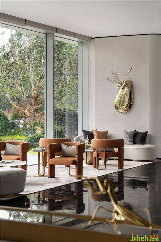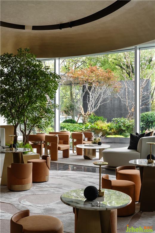 悠悠綠意下,室內(nèi)的青翠與窗外的自然景觀形成和諧的樂(lè)章,江西售樓處設(shè)計(jì)在橘調(diào)皮椅的點(diǎn)綴下,賦予空間更鮮活的自然色彩。