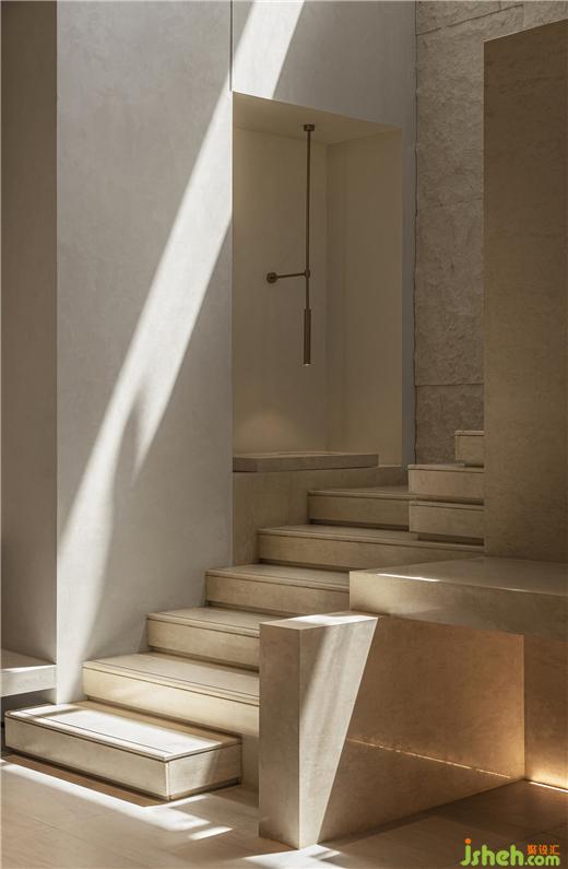 垂落的吊燈與地上的暖光,溫暖了空間并帶來了大地般穩(wěn)重感,陽光透過天窗,廣州疊墅設(shè)計(jì)順著階梯落下一份令人敬仰的神圣感。