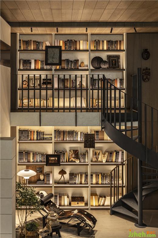設(shè)計(jì)師將一面空間打造為雙層的小型圖書館,旋轉(zhuǎn)扶梯減去繁雜的裝飾更具有樸素的古典風(fēng)韻。