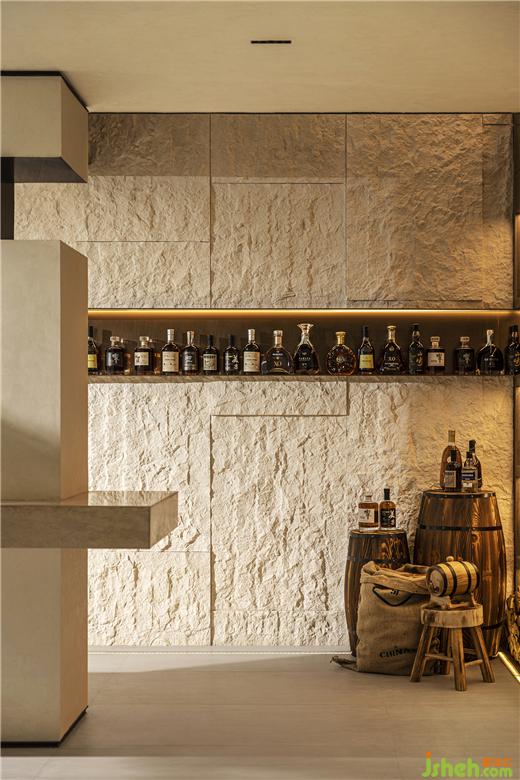 石頭是連接大地的橋梁,巖板與砂石材質(zhì)的巧妙應(yīng)用,廣州疊墅設(shè)計(jì)讓餐吧更具復(fù)古韻味,琳瑯滿目的美酒可以任意甄選品嘗。
