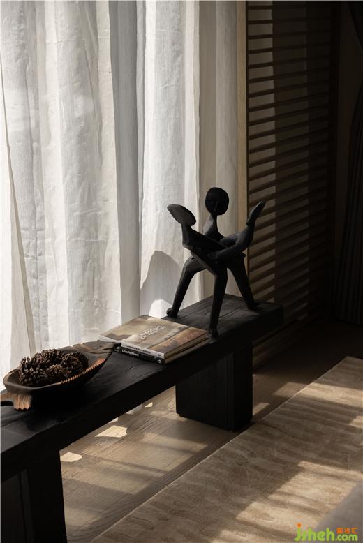 黑色的木柜與凳子與空間縱橫線(xiàn)條相呼應(yīng),廣州疊墅設(shè)計(jì)原木質(zhì)感留住自然的詩(shī)意。