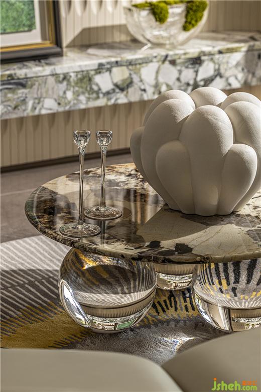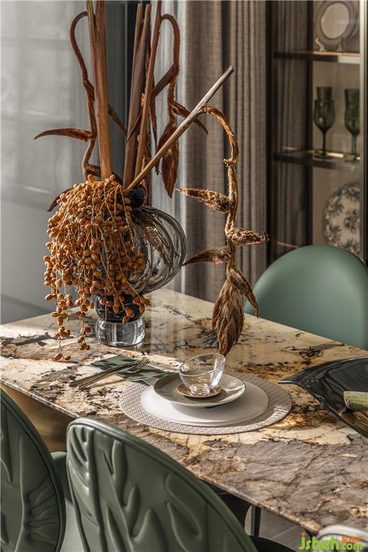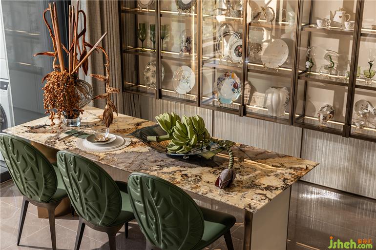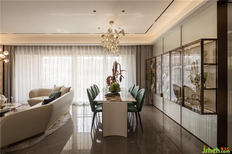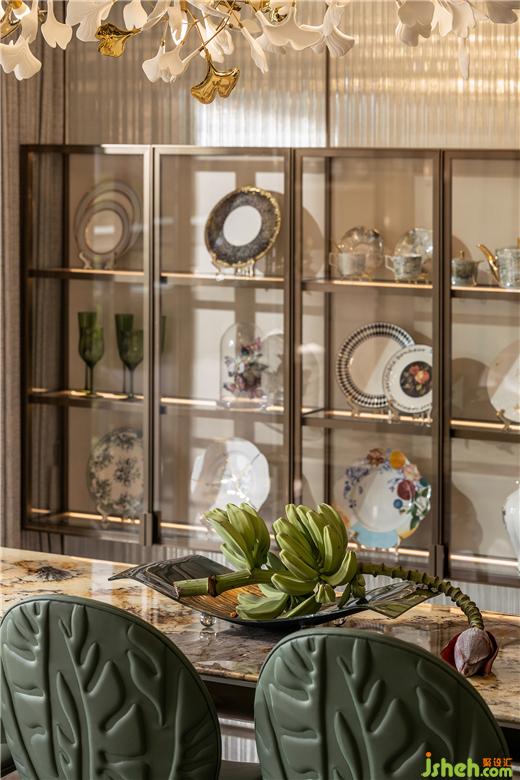 福州樣板間設計精致的瓷器藝術品,在陽光透過茶色玻璃的照耀下明亮動人,一片片銀杏葉擬態(tài)組成的花燈,白金交織,頓生一室典雅。