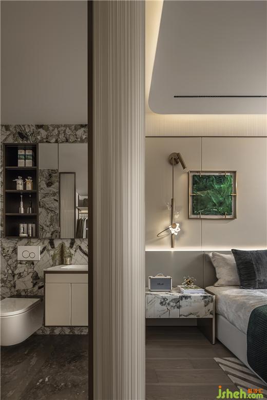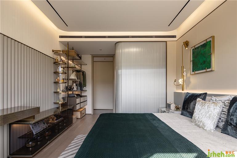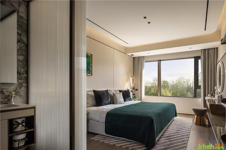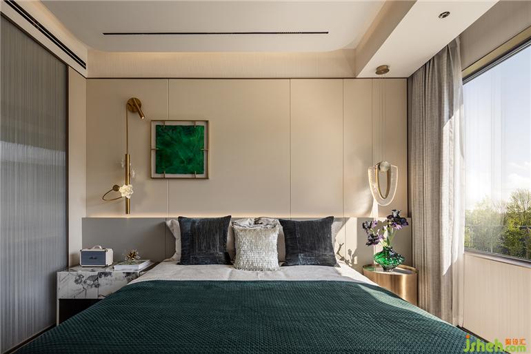 墨綠掛畫成為房間中最點睛的一筆,晨起拉開窗簾引自然的詩意入室,福州樣板間設計溫和日光讓空間更顯寬闊。