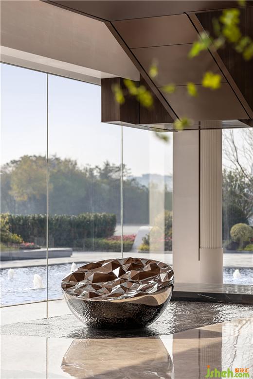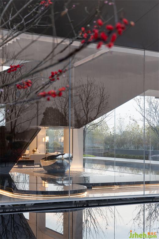室內(nèi)與室外的風(fēng)景相呼應(yīng),營(yíng)銷中心設(shè)計(jì)在水面的倒映下,外界的自然豐富內(nèi)里的空間層次,閑坐窗邊,風(fēng)不時(shí)吹起漣漪,感受恬然與靜謐。