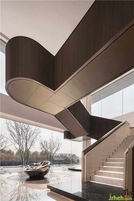 波浪般的白墻體勾起優(yōu)雅的弧度,營(yíng)銷中心設(shè)計(jì)在光影的手法下,靈動(dòng)生形。心靈更貼近自然,潺潺流水,心曠神怡。