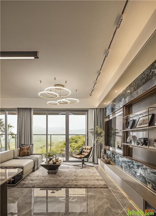 廣州保利錦上樣板房設計線性元素開闊客廳的視野,金屬色相襯凸顯室內溫和明亮的氛圍,陽光灑入,在自家陽臺便可以呼吸滿山輕氧,給生活透透氣。