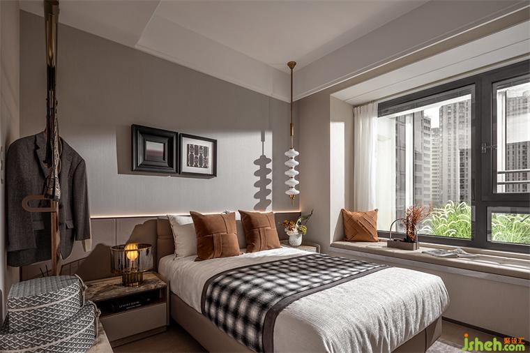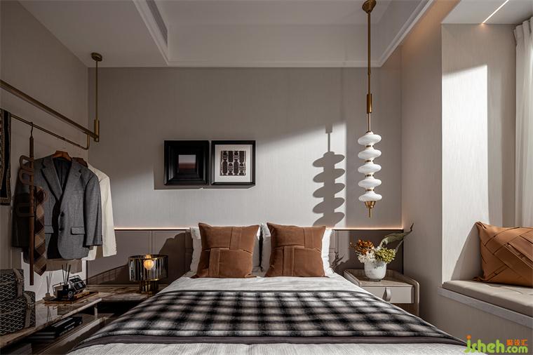 黑白格紋搭配橘色單品為臥室抹上沉穩(wěn)的底色,室外春意盎然,上海樣板房設計穩(wěn)重的秩序感中不乏憩息處的休閑舒適。