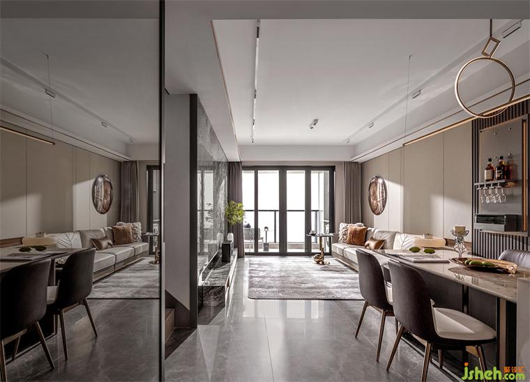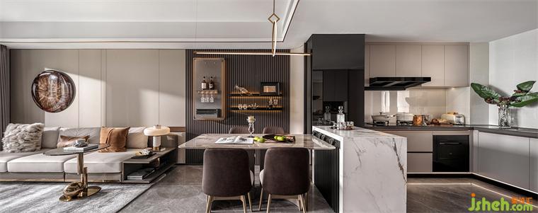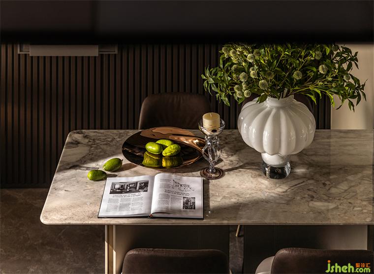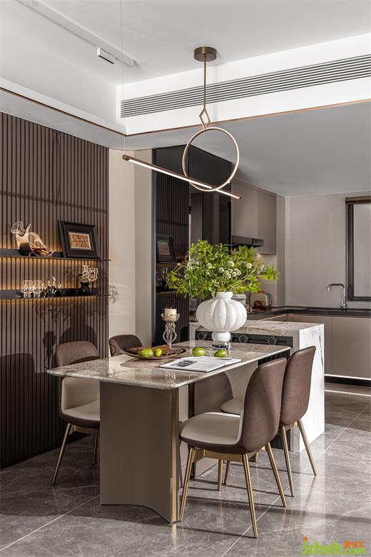 燈具選擇在一定程度上決定家的品味與舒適度,圓形、菱形與直線的幾何組合利落勾勒出雅致,深色木飾面作為餐廳的背景墻承載了吧臺的功能,與椅子的顏色呼應,凸顯成熟氣質(zhì)。