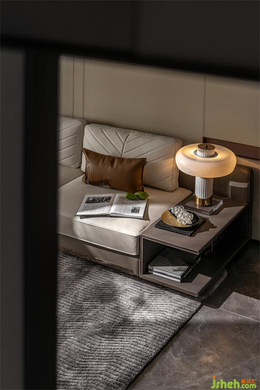 中山保利樣板間設計選用可移動的小茶幾,令中央活動空間更顯靈活寬敞,優(yōu)雅的金屬幾何體構(gòu)造帶來藝術氛圍,與圓柱體臺燈相和諧,靜靜在書頁文字里找回深度閱讀的耐心。