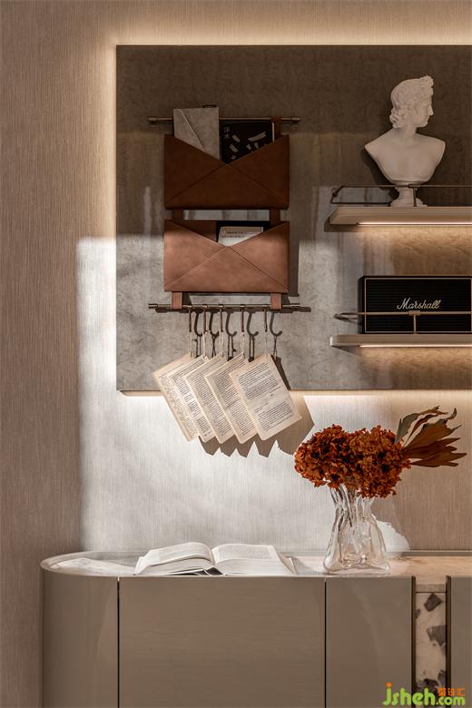 橘紅調(diào)的房間里是滿滿的文雅氣息,古樸的書頁、爛漫的紅花,光影之下凝住了歲月的美好。