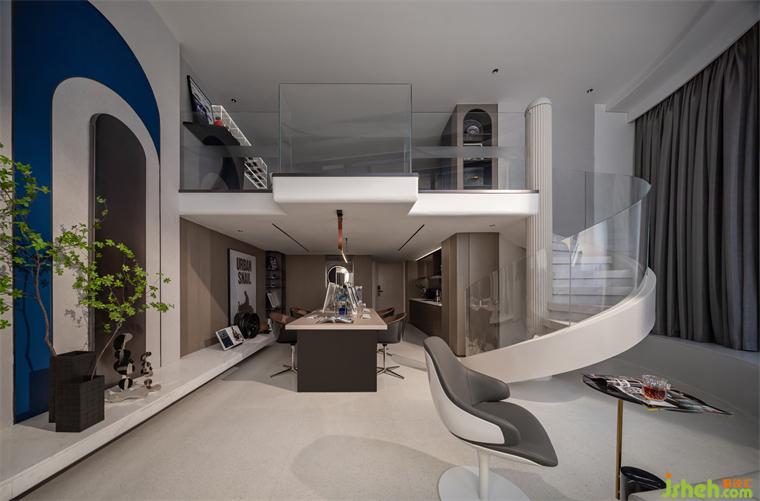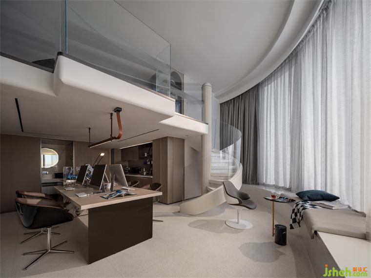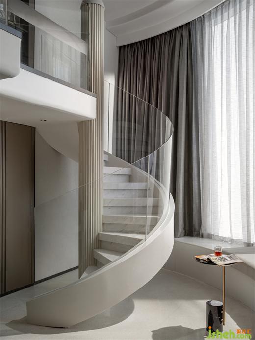 弧形玻璃幕墻為俯瞰城市景色提供開闊視野,玻璃扶手沿著旋轉(zhuǎn)樓梯延伸到二樓,日升暮落,淸凈明亮的光影在室內(nèi)流轉(zhuǎn)。