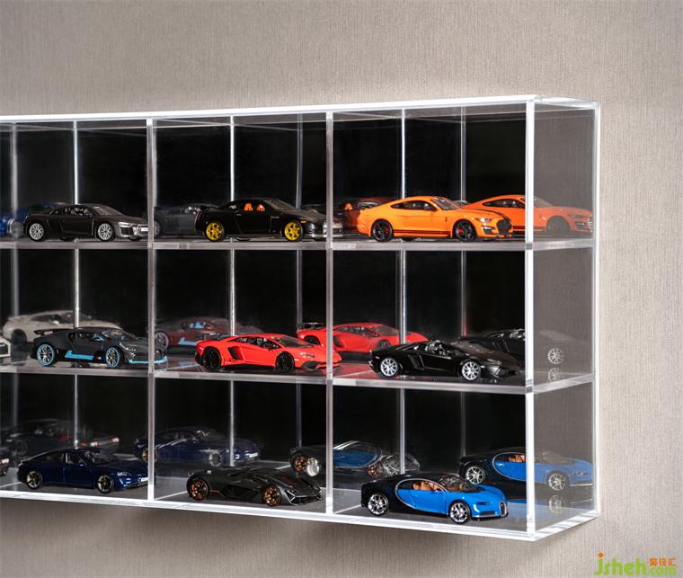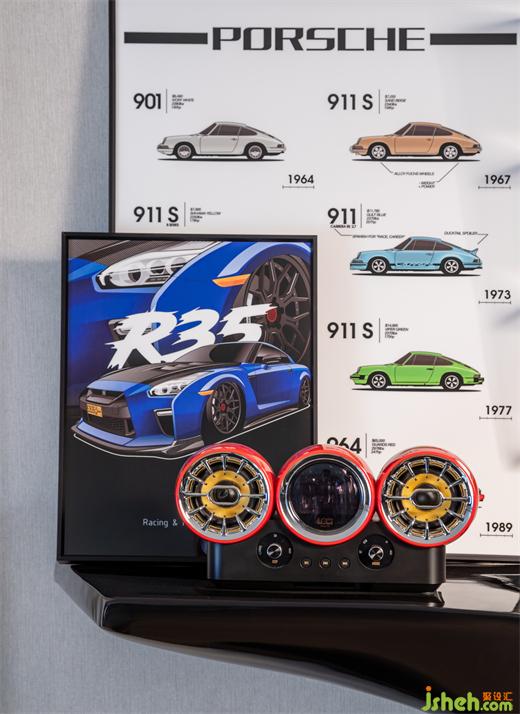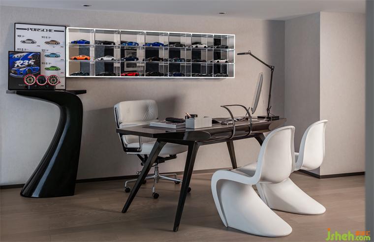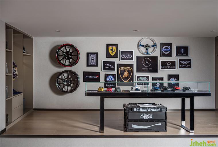 廣州公寓設(shè)計二樓作為私人辦公區(qū),工作、收藏展示功能融合,汽車元素是空間的主旋律。