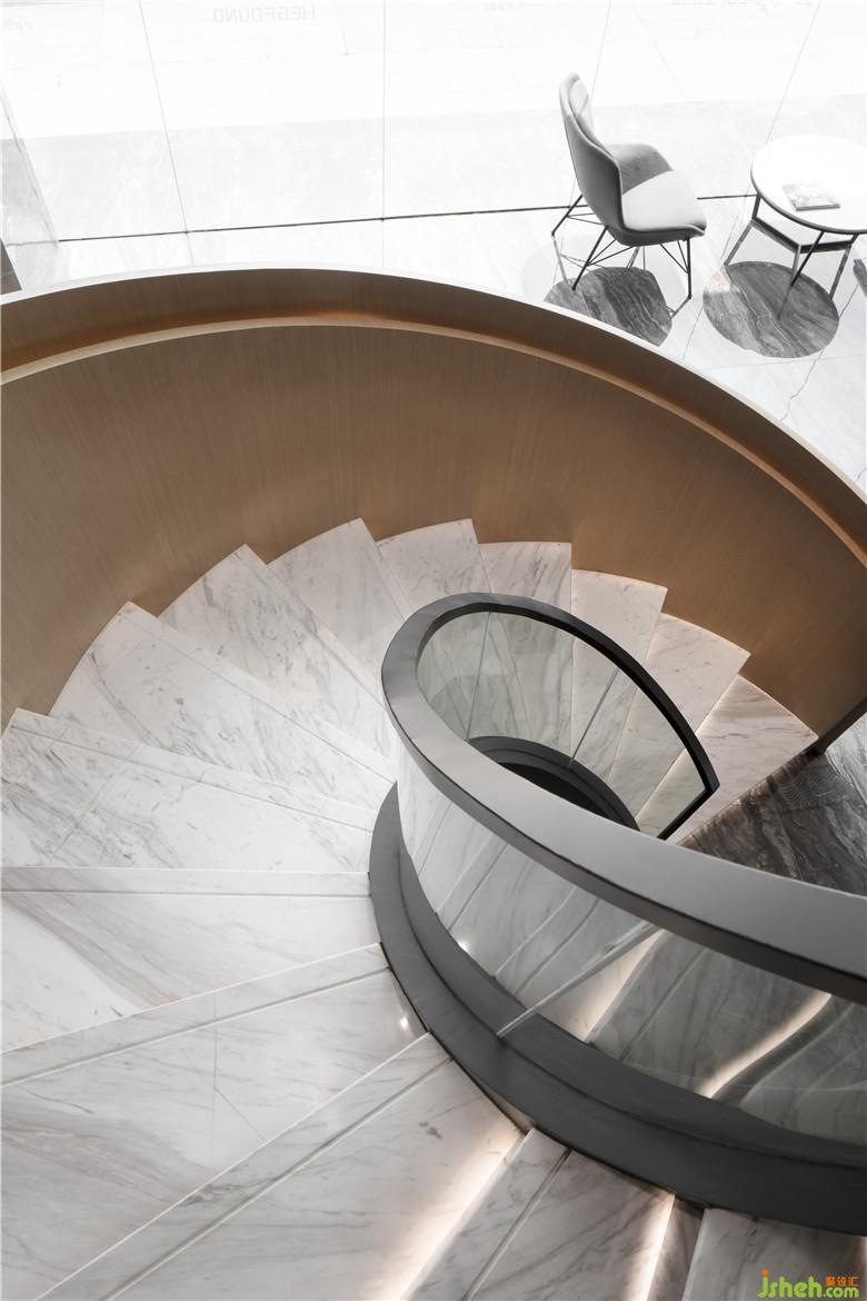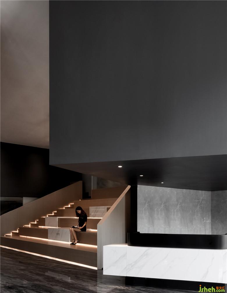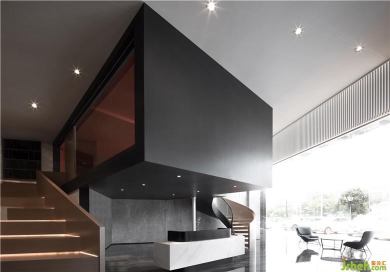 洽談室在設計上做了獨特處理,利用斜插出來懸挑的盒子體作為建筑構造,使空間獨特而富有張力。用扇形的階梯空間連接左右兩邊的盒子結構。使空間相互交錯,互相呼應,溫潤的木質材料與冰冷的大理石地面相互碰撞,渾然天成。通過屋頂焊接工藝,將盒子結構懸浮于空中,顛覆人們對于力學的常規(guī)感受!
