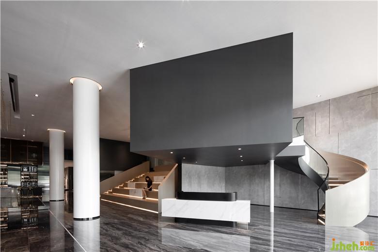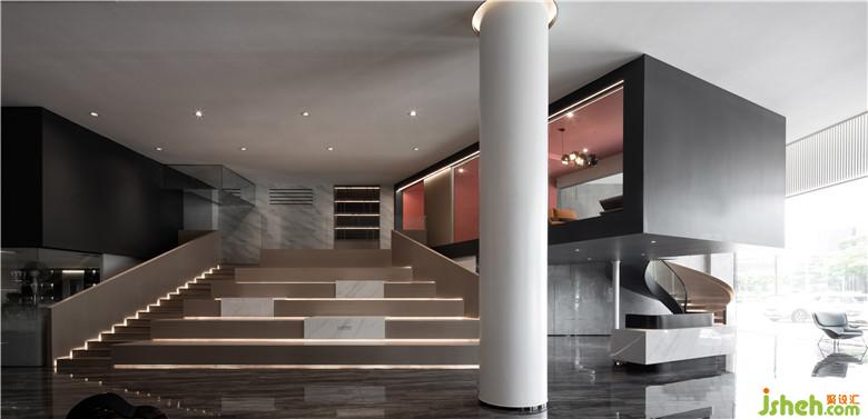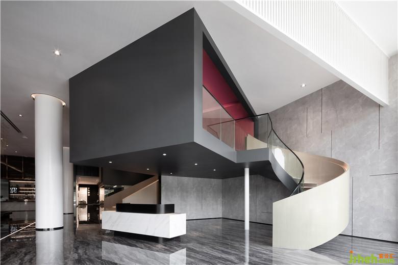 恒福陶瓷企業(yè)是佛山具有悠久歷史的本土品牌,整體一樓層高近六米,在空間高度上具有極好的優(yōu)勢,我們充分的利用了這個優(yōu)勢,用建筑語言對空間進行了改造,通過幾個挑空的盒子穿插,營造一個復式空間結構,使空間具有建筑立體屬性。所有功能對應的空間幾何在挑空區(qū)域交織,使空間和人形成一個極具張力的對話,進而完成空間的獨特性。