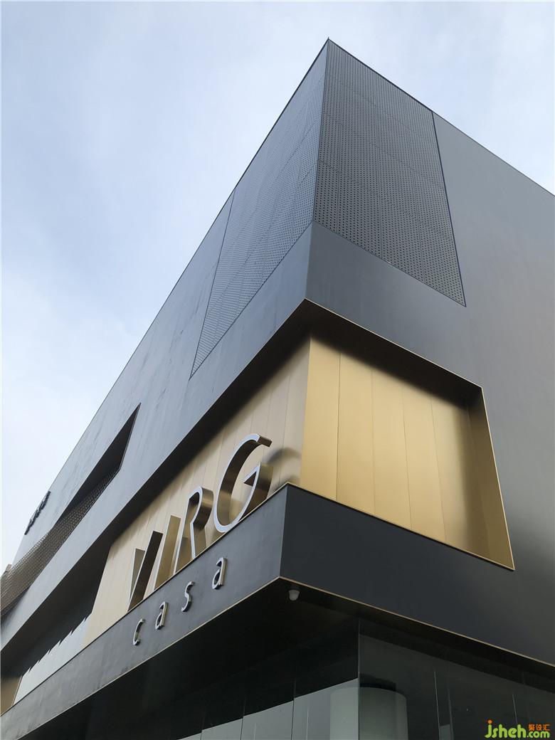 這是一個舊建筑改造項目,共四層,總面積達4000平方米。外立面以深灰涂料展現(xiàn)質(zhì)樸氣質(zhì),不規(guī)則的矩形開口凸顯韻律感,45度扭轉(zhuǎn)穿插的網(wǎng)狀黃銅結(jié)構(gòu)更添藝術(shù)美感。豐富多樣的立面構(gòu)圖使建筑物獨具象征性而又與所在環(huán)境融合。