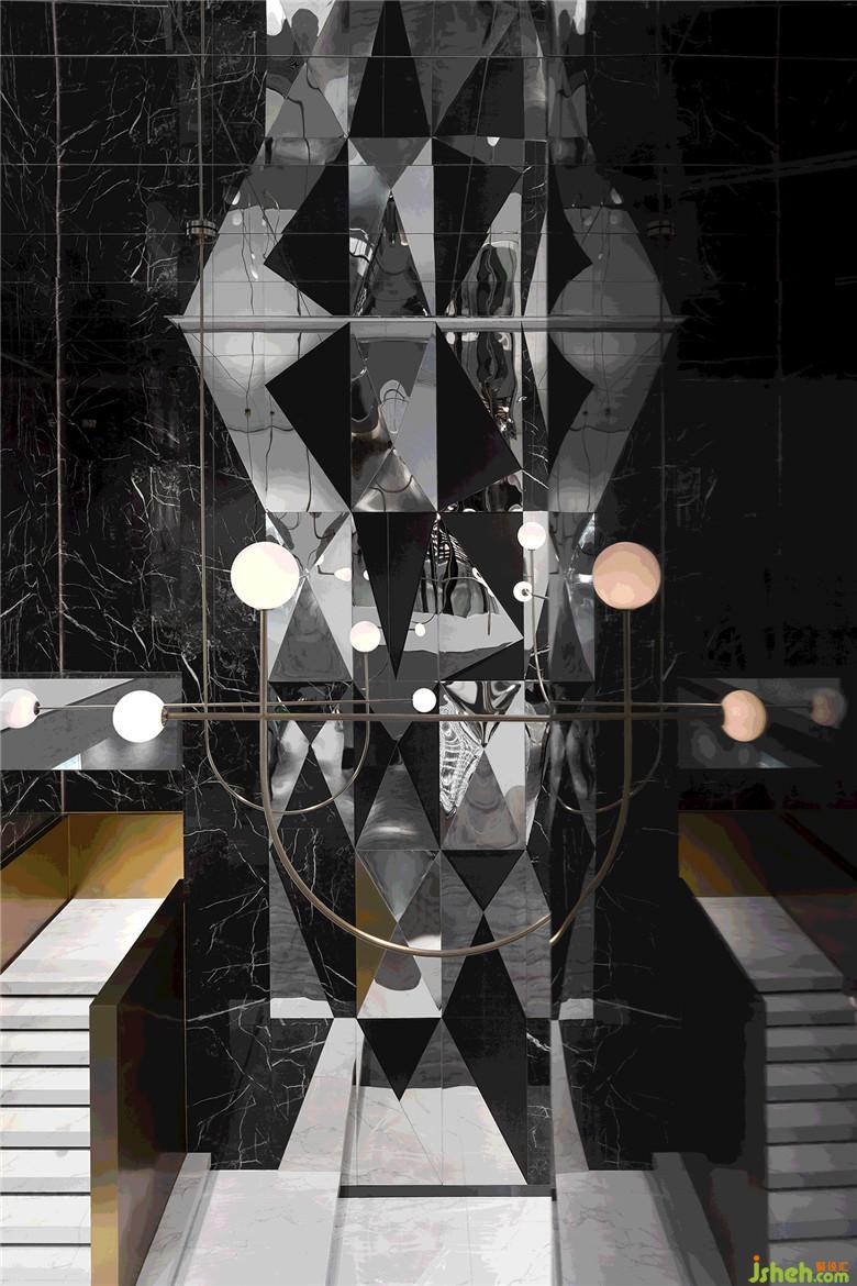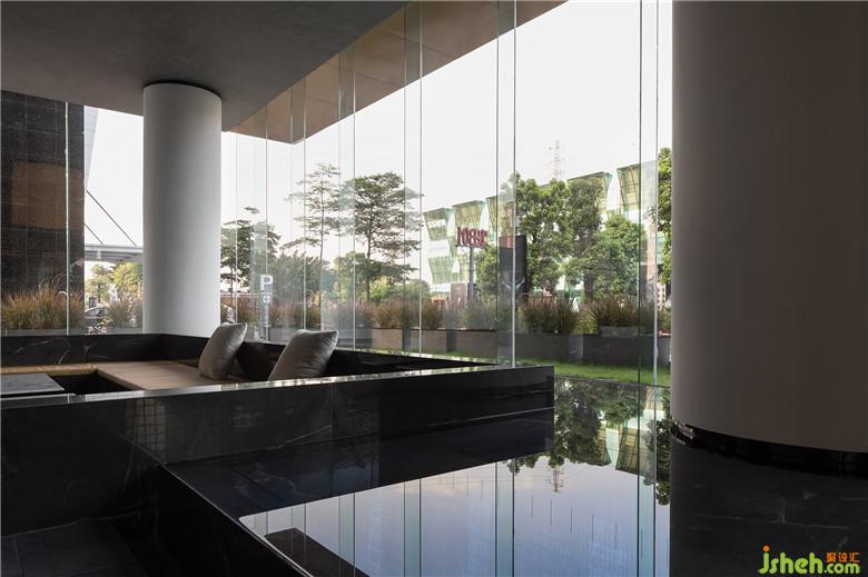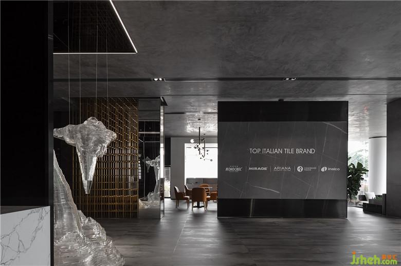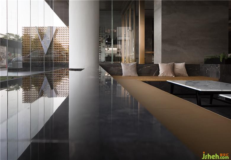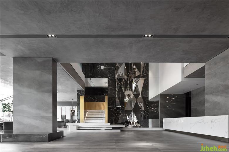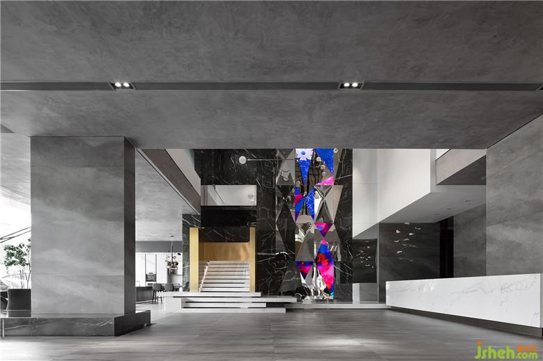 主接待臺以白色仿大理石瓷磚鋪就,與線型燈飾構(gòu)成厚重與輕盈的對比。雙倍高的深色陶瓷背景墻嵌入了巨幅的LED不銹鋼飾面,在鏡面天花的反射下形成四層中空的視覺效果。動態(tài)畫面使空間在黑白灰的基礎(chǔ)上融入彩色魅力。