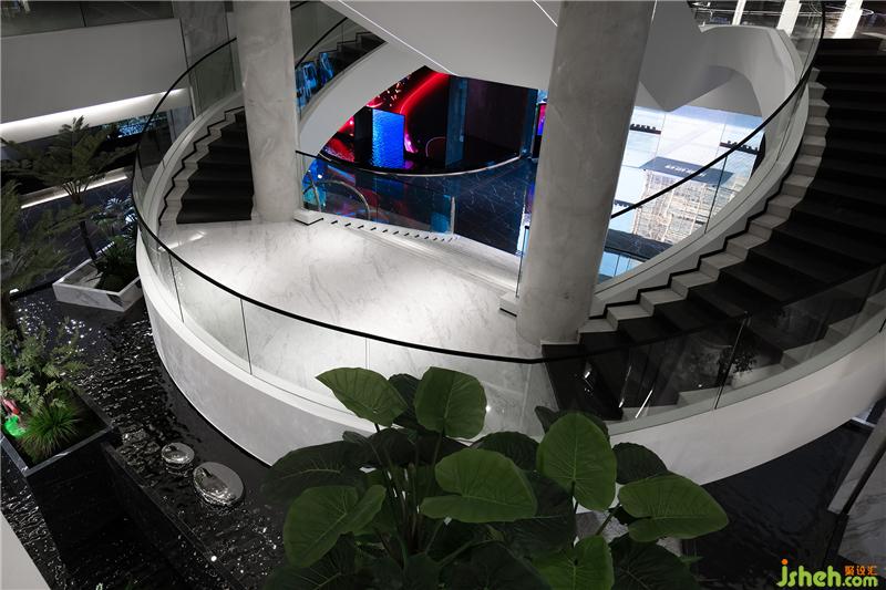 原始建筑結(jié)構(gòu)有諸多不合理的地方,比如龐大而笨重的樓梯堵在入口大堂,將整個(gè)空間一分為二,中間一個(gè)巨大中空占據(jù)了最主要空間,在主體建筑結(jié)構(gòu)不變的情況下如何通過(guò)局部空間改造讓分離的空間串聯(lián)起來(lái),流動(dòng)起來(lái),使得舊的建筑煥發(fā)新的光彩!總部展廳設(shè)計(jì)