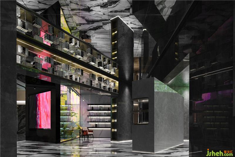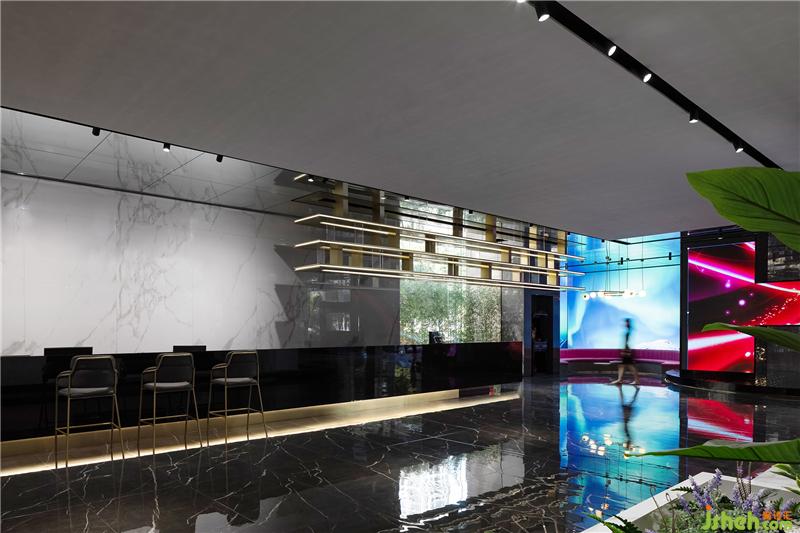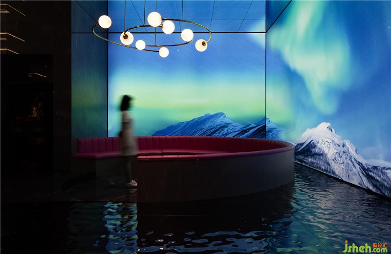 入口休閑區(qū)穿插著多媒體的形式以呈現(xiàn)最佳的展示效果,借助這種方式,讓客戶(hù)在虛擬場(chǎng)景空間中慢慢享受科技帶來(lái)的全新感受。漫步其中,伴隨輕柔音樂(lè)律動(dòng)而產(chǎn)生迷離虛幻的動(dòng)感畫(huà)面,虛擬的極光映襯在水面上,在空間中融合科技元素,創(chuàng)造出獨(dú)特的沉浸式場(chǎng)景體驗(yàn),勾引人們對(duì)未知世界的探索欲望??偛空箯d設(shè)計(jì)
