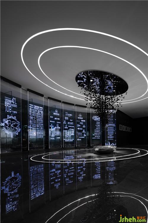 橢圓形線光把天花和地面相互呼應(yīng),倒三角的木炭裝置像懸浮的碎片,形成一個富有文化調(diào)性的空間。將品牌故事用文字的方式篆刻在有機玻璃上,通過藏光使它漂浮于空中,有效增強空間的科技感和視覺特效!