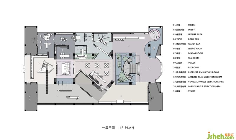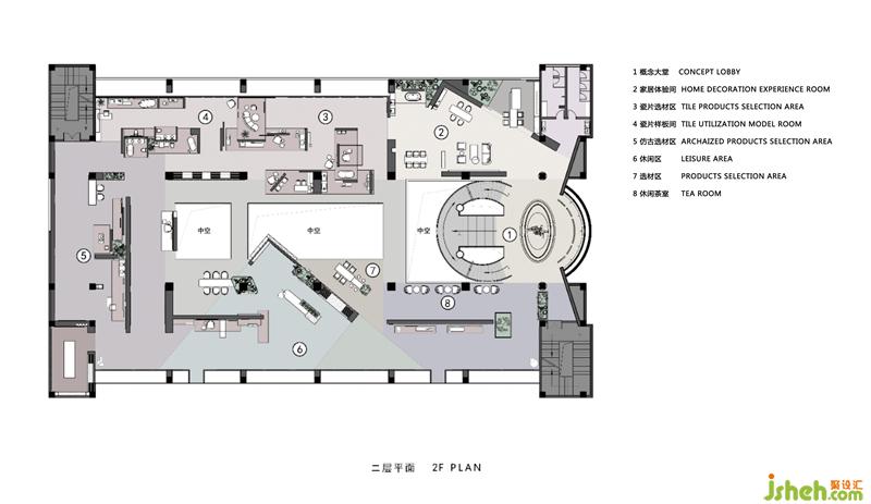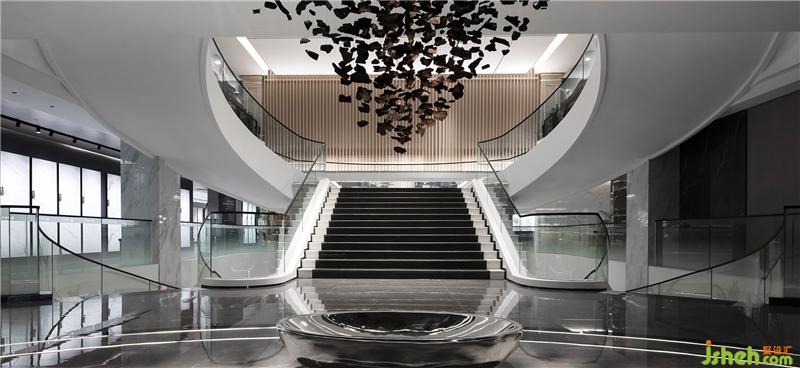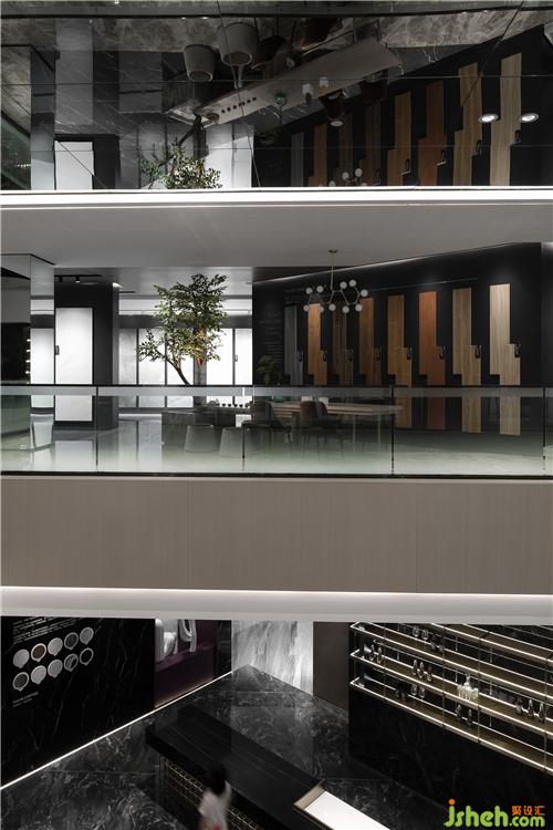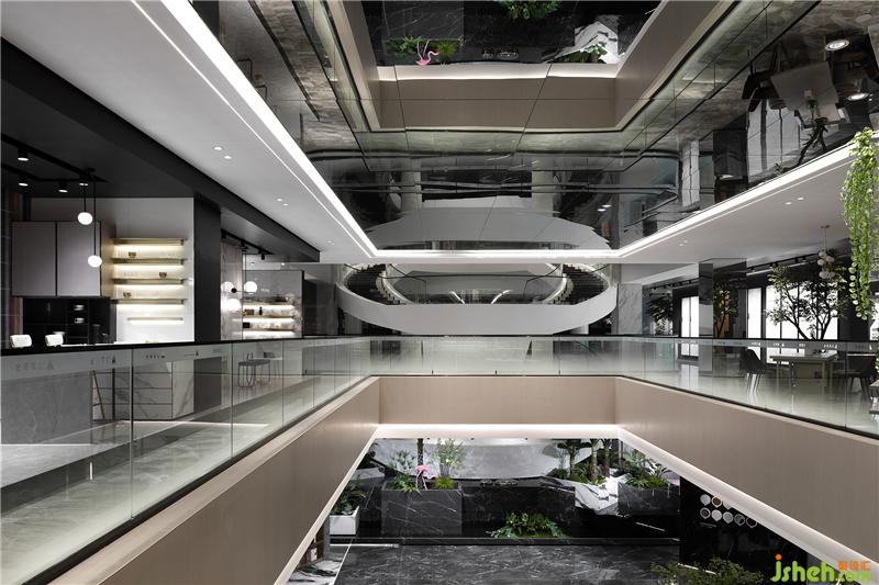 整體三層的空間是開放和流動的,沒有明確的空間邊界相互穿插在一起,但卻有隱藏的精心設(shè)定的交錯關(guān)系。鏡面天花把整個空間無限延伸,從而使得整個空間達到了視覺上的最大化??偛空箯d設(shè)計