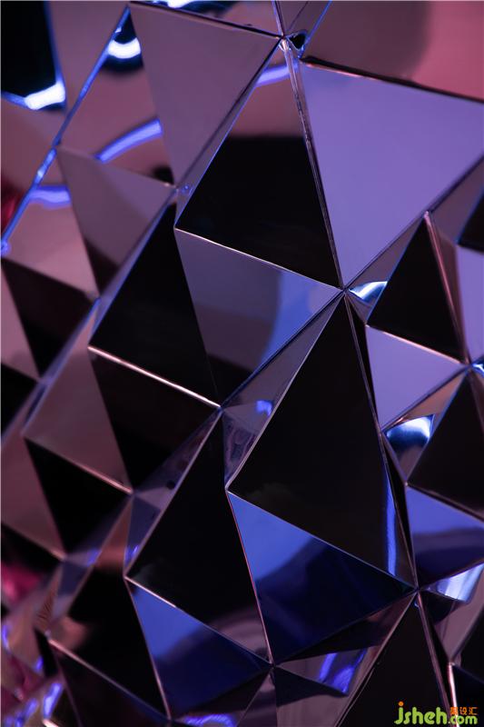 雨沐在燈光和菱形鏡面不銹鋼的映襯下