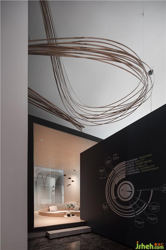 視覺引導(dǎo)觀者從物質(zhì)結(jié)構(gòu)轉(zhuǎn)換成思考和聯(lián)想模式,也是設(shè)計師對于物質(zhì)空間如何深入轉(zhuǎn)化的再次探討,線索從入口開始穿過黑色長廊,幾經(jīng)輾轉(zhuǎn),結(jié)束于時空之中,這種元素極大程度的構(gòu)建了空間,他們可以足夠大,使人迷失,也足夠小,使人見己佛山展廳設(shè)計。