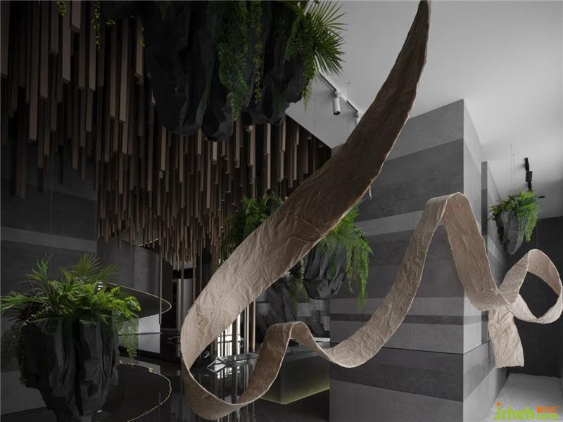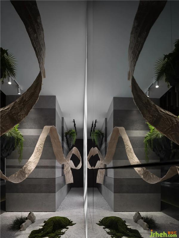 劉禹錫在《陋室銘》里寫(xiě)道:“苔痕上階綠,草色入簾青,無(wú)絲竹之亂耳,無(wú)案牘之勞形……”,設(shè)計(jì)師大量運(yùn)用自然而質(zhì)樸的材質(zhì)表達(dá)空間的純凈感,用草木山石點(diǎn)綴其中,枯木和青苔石相互映襯,表達(dá)出生命的新陳代謝和以及周而復(fù)始的過(guò)程。