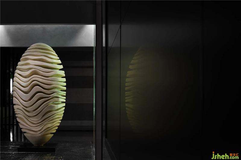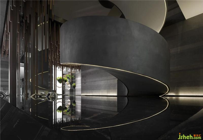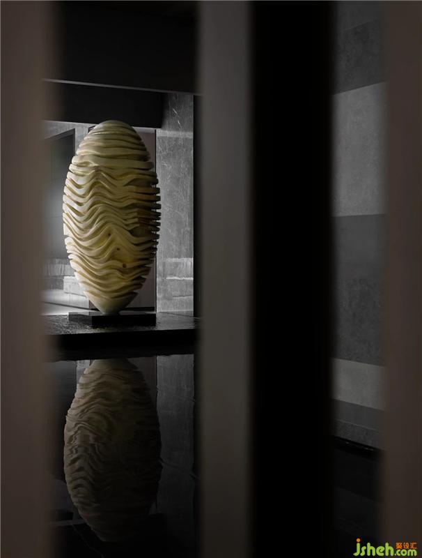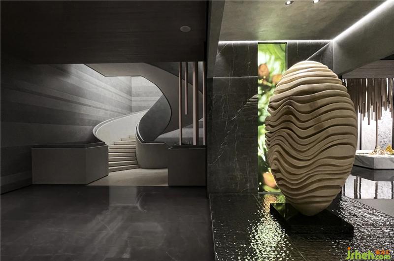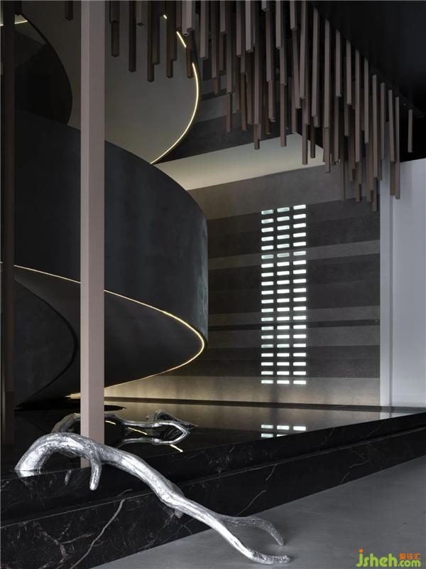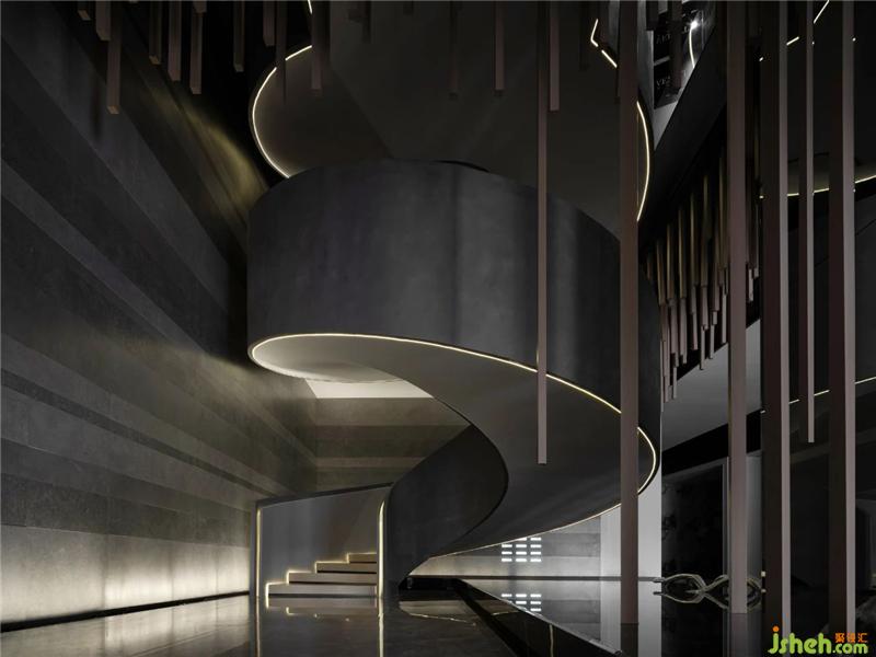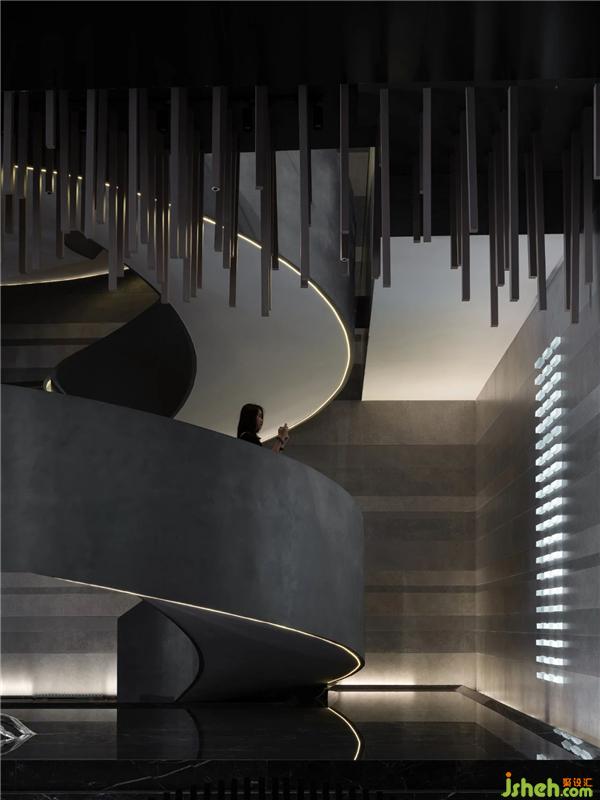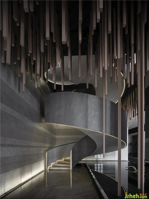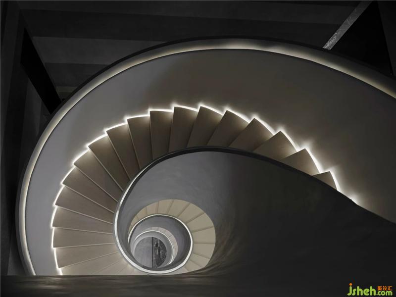拾階而上,以灰色水磨石墻面以及微水泥質(zhì)感的樓梯扶手為主調(diào)的樓梯間表達(dá)出空間的自然寧靜,蜿蜒而上的旋轉(zhuǎn)樓梯將人的視線向上延伸,榕樹枝干沿著空間的間隙向上穿插,弧形曲面和垂直線在空間里相互對(duì)比,這種沉浸式的空間氛圍極大的調(diào)動(dòng)參觀者的好奇心,希望能更進(jìn)一步的一探究竟,設(shè)計(jì)師在空間表現(xiàn)上除了強(qiáng)調(diào)視覺的美感更希望挑動(dòng)觀者的心理情緒。