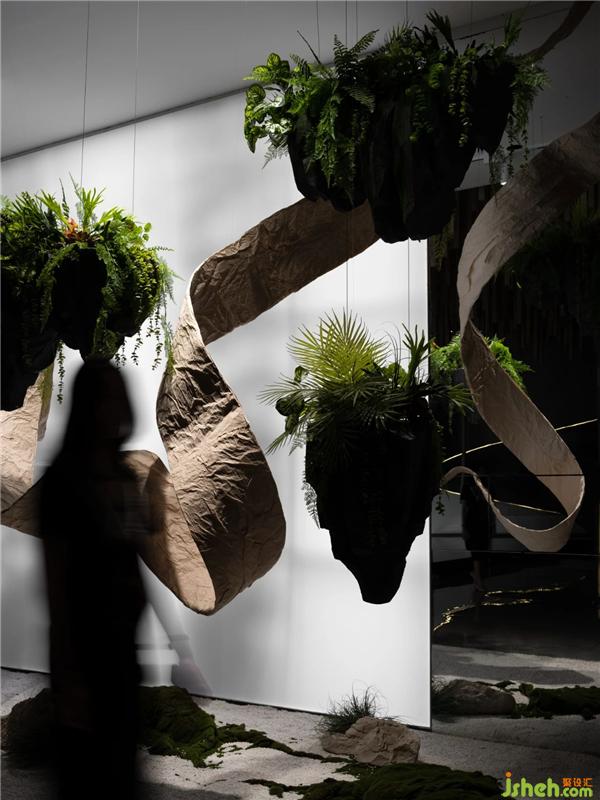 二樓的空間以“孕育”作為空間主題,首先,生態(tài)的環(huán)境植物的繁衍給生命的誕生提供了基本條件。其次,關(guān)于生命的起源有不同的解讀,中國古代有一種說法是“腐草化繭,破繭成螢”,意思是生命源于螢火蟲的“蟲繭”。老子在道德經(jīng)里講生命是由一種“ 混沌之氣”混合而成,因此,設(shè)計(jì)師在空間營造了一個(gè)“蟲繭”裝置,以此代表著生命的孕育過程。