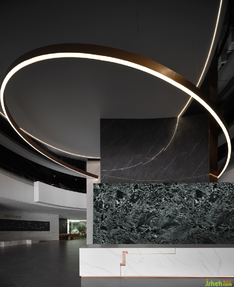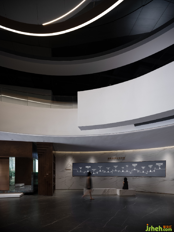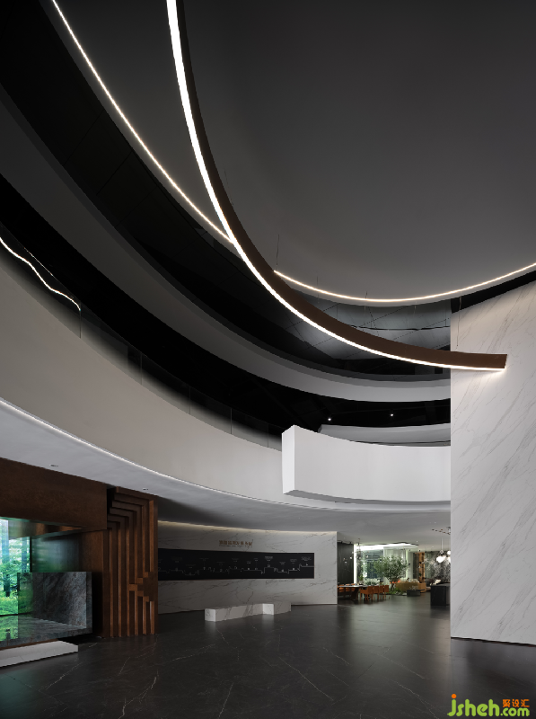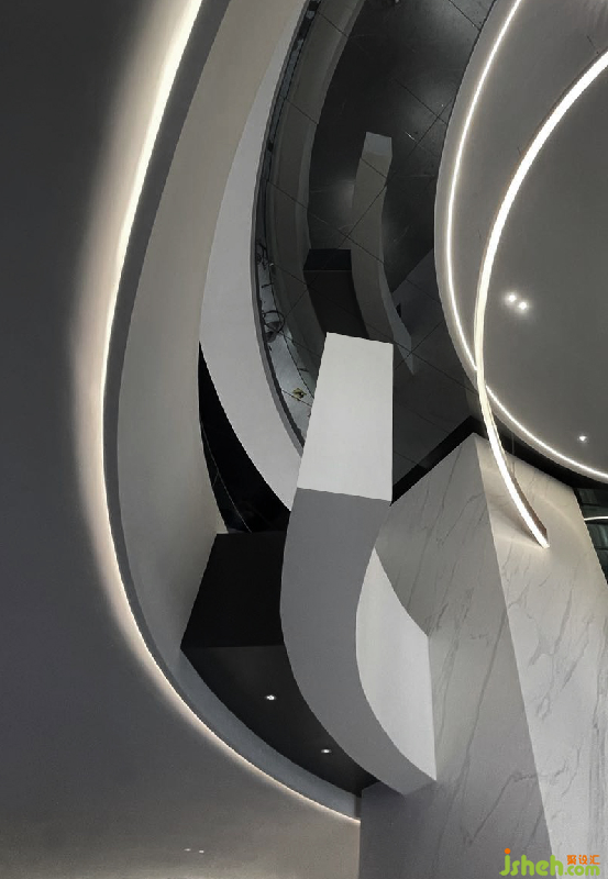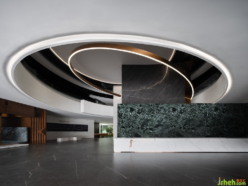 大堂的圓形中空除具有建筑幾何美感,也隱含了東方哲學(xué)觀念的“天圓地方 ”,更表達(dá)出一種星球運(yùn)動的軌跡。環(huán)繞線條元素在三維空間里按照美的視覺效果、力學(xué)的原理進(jìn)行編排和組合,營造出“別有洞天“的空間感受。