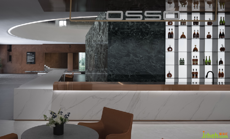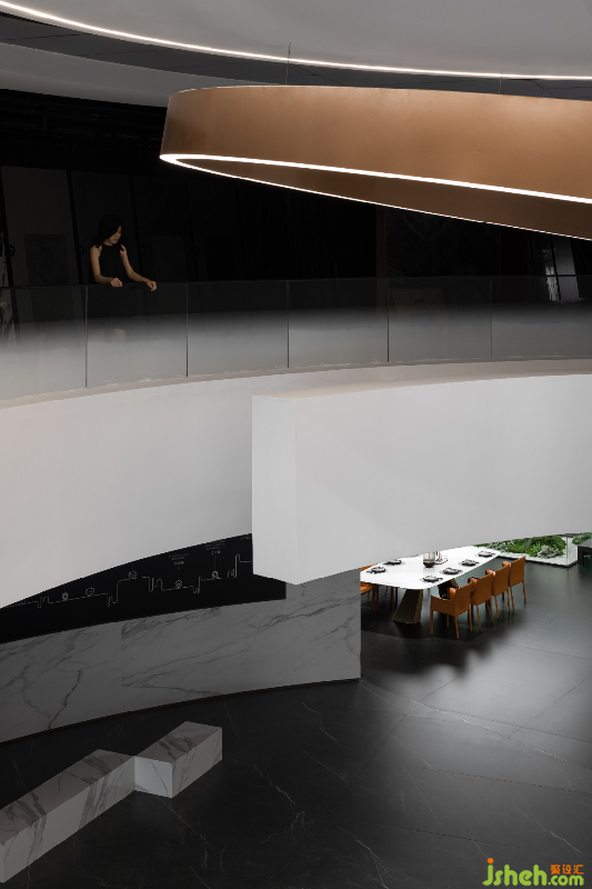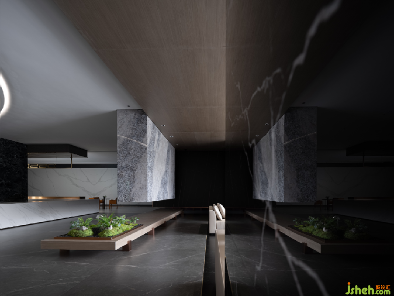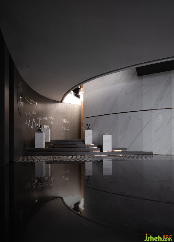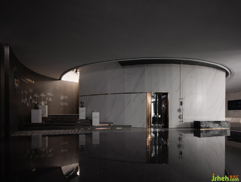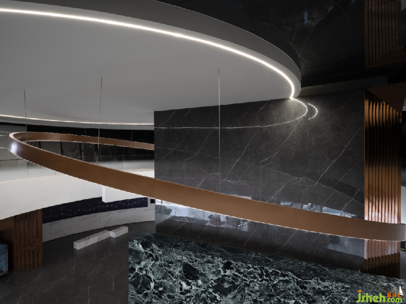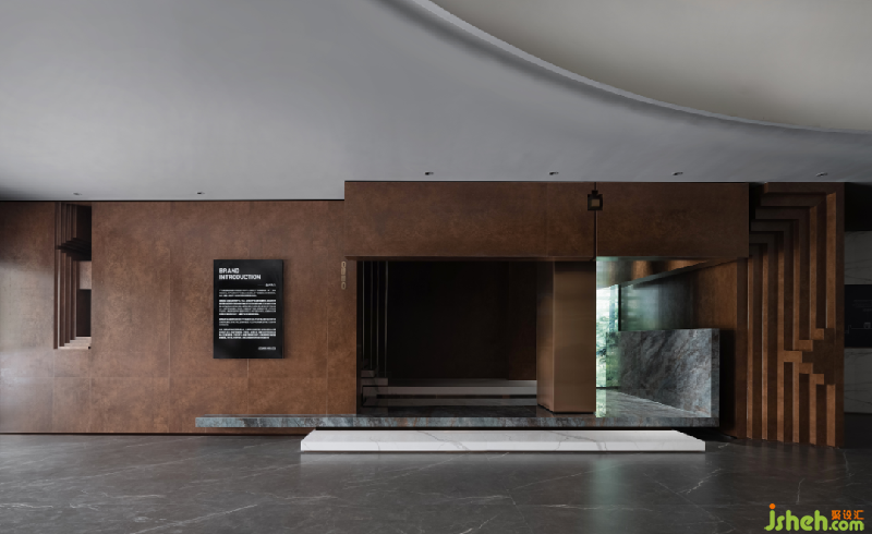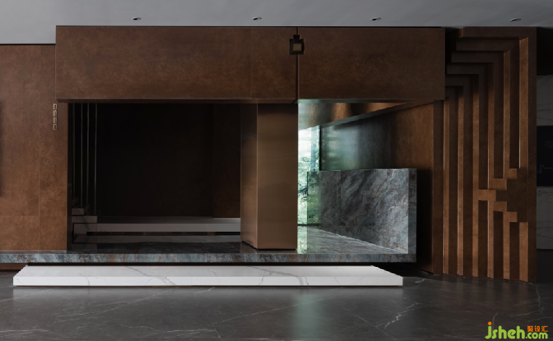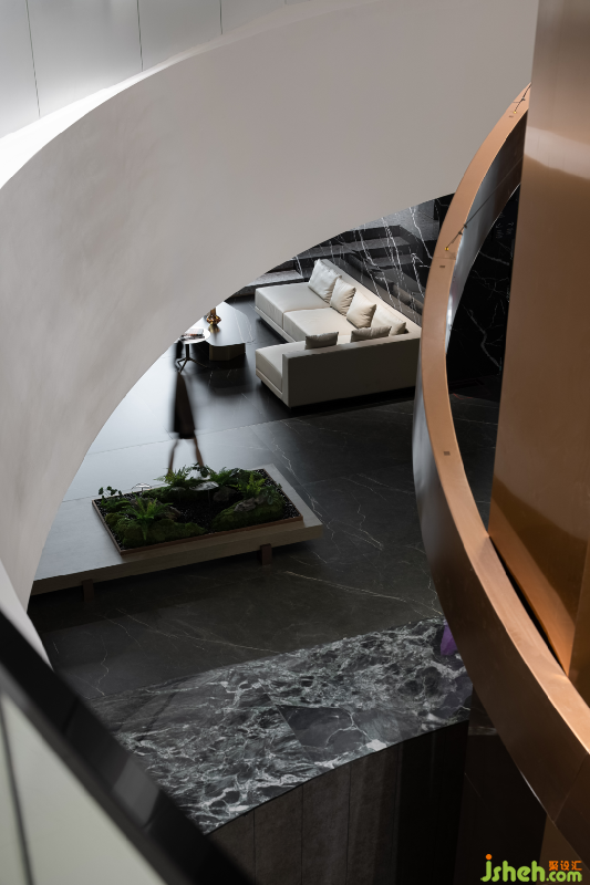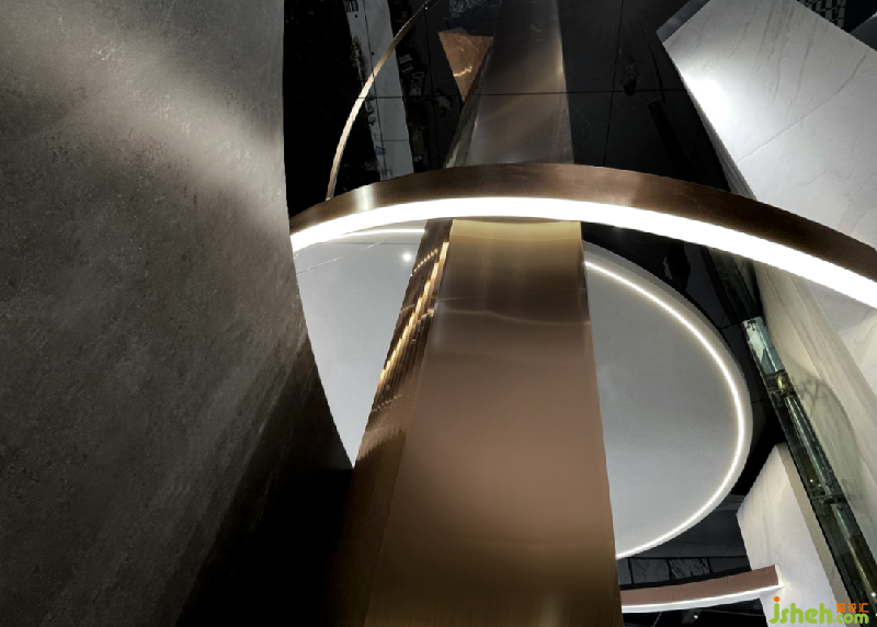 結構的縱深通過光影的變化而漸次遞進,設計師通過將結構體有序的分離重組,讓平面的墻體變成具有立體幾何美感的雕塑,既增強空間的結構張力,也凸顯工業(yè)時代的精磨精切的工藝加工品質佛山巖板展廳設計。