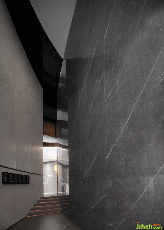 通過結構、體塊的劃分與設計,在室內設計中創(chuàng)造“建筑感”,讓樓梯入口立面,形成有序遞進的凹凸感,捕捉燈光下的陰影,運用墻的端部,表現(xiàn)墻的厚度感等。