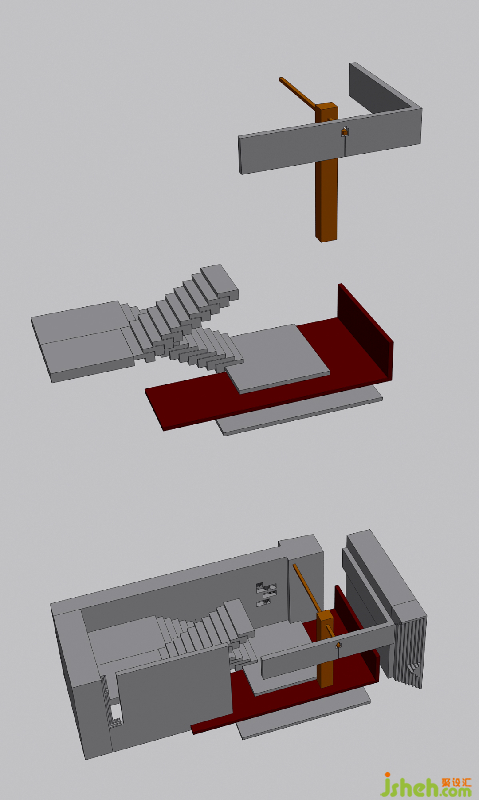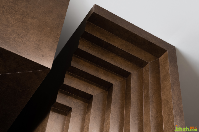 建筑原樓梯間本是一個平淡無奇的雙跑樓梯構造,設計師刻意強化和凸顯的樓梯間的空間構造,使樓梯間呈現(xiàn)出一種結構美學體驗感。材質上選用赭紅色的銹鐵質感的巖板搭