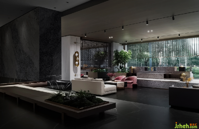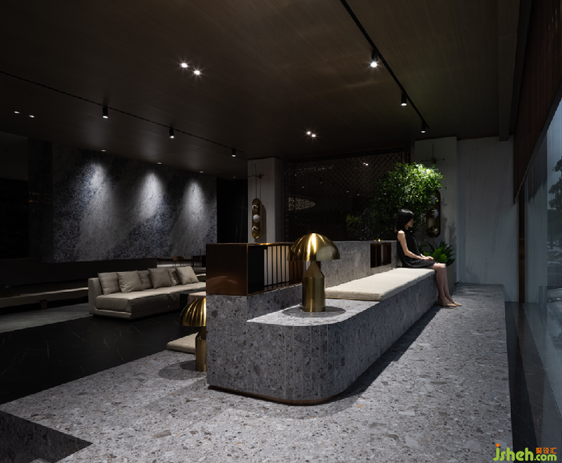 大堂吧通過松弛有度的地臺設(shè)計,營造一處內(nèi)外有別的休閑場所,向內(nèi)可以輕松暢聊,向外可以欣賞窗外的景致,水磨石質(zhì)感的坐臺顯出自然生態(tài)感,金屬屏風(fēng)以及臺燈更增加精致的生活品質(zhì)感,理想與現(xiàn)實(shí)于此碰出最相宜的相處模式。