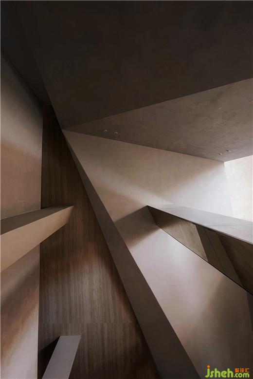 原建筑除了朝西面有窗戶,其他三面都是封閉空間。巖板展廳設(shè)計(jì)師對(duì)建筑結(jié)構(gòu)進(jìn)行優(yōu)化改造,特別是在展廳東面的轉(zhuǎn)角處打開一個(gè)三層中空天井,在三樓東面鑿開一扇窗,將一束陽(yáng)光引進(jìn)室內(nèi),中空天頂采用倒三角的設(shè)計(jì),而朝窗外的斜面則使用了鏡面材質(zhì)。通過(guò)鏡面的反射作用,光線進(jìn)行了二次折射,使陽(yáng)光穿過(guò)梁柱傾瀉進(jìn)來(lái),使整個(gè)空間瞬間變得神圣起來(lái)。