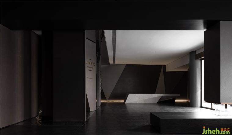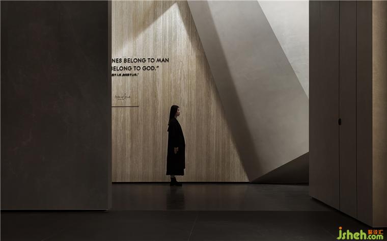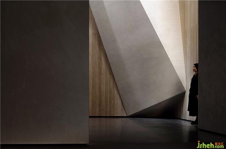 通過(guò)各種不同比例的斜形去切割空間形態(tài),將不同的體塊進(jìn)行拆解和重組,用幾何構(gòu)成的語(yǔ)言建構(gòu)成交錯(cuò)而又充滿矛盾的空間狀態(tài),這里不再是傳統(tǒng)的材料展廳,它更像是一個(gè)立體畫廊,一個(gè)由記憶碎片拼接而成的非現(xiàn)實(shí)空間。