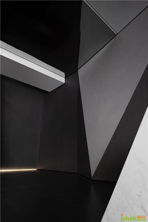 大堂以斜形切割重新構(gòu)建巖板展示空間,擺脫建筑原有的橫平豎直方式,巖板展廳設(shè)計(jì)塑造一種類似于“菱境”般的空間狀態(tài)。菱形切割是鉆石的加工方式,代表了一種極致的加工工藝,菱形切割使每個(gè)塊面都呈現(xiàn)出不同的受光狀態(tài),展現(xiàn)了獨(dú)特的幾何之美。