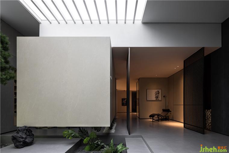 “久在樊籠里,復(fù)得返自然”。從狹長的通道空間走出來,穿過一個石塊堆疊的洞口,眼前一片開闊。這里被設(shè)計成一個戶外庭院,其中有一條素色水泥質(zhì)感的巖板小徑,巖板展廳設(shè)計以及庭院中央的茶亭。天光的注入給這個空間帶來了一種別有洞天的感覺,它被賦予了靜謐和詩意。