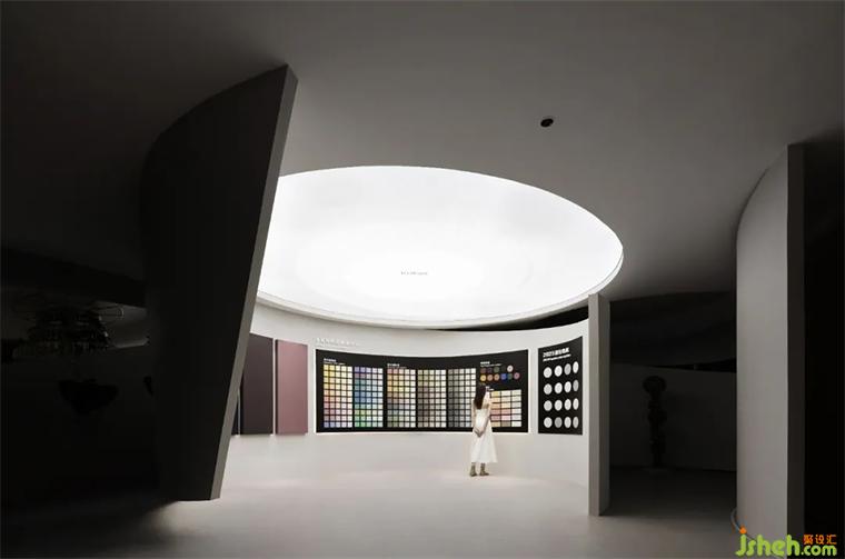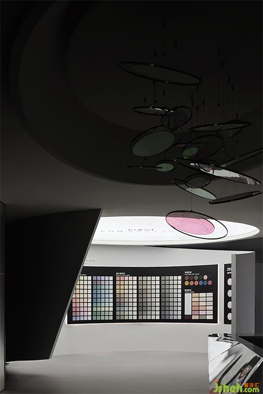 在展廳的大堂領(lǐng)域,一組絢麗的圓形彩色亞克力燈片宛如星辰點(diǎn)綴。燈光如詩,穿越彩色的亞克力燈片,輕輕撫摸過墻面和地面,把空間幻化成夢(mèng)幻的彩色宇宙。這一巧妙的設(shè)計(jì),如同旋律繞梁,不僅在視覺上演奏出動(dòng)人的音符,更賦予了展廳獨(dú)特的靈魂和氣質(zhì),進(jìn)一步詩化了涂料展品的主旋律和特色。