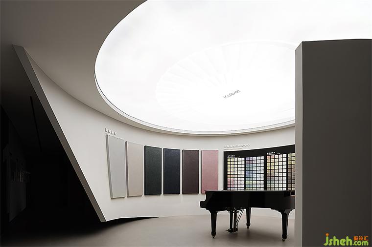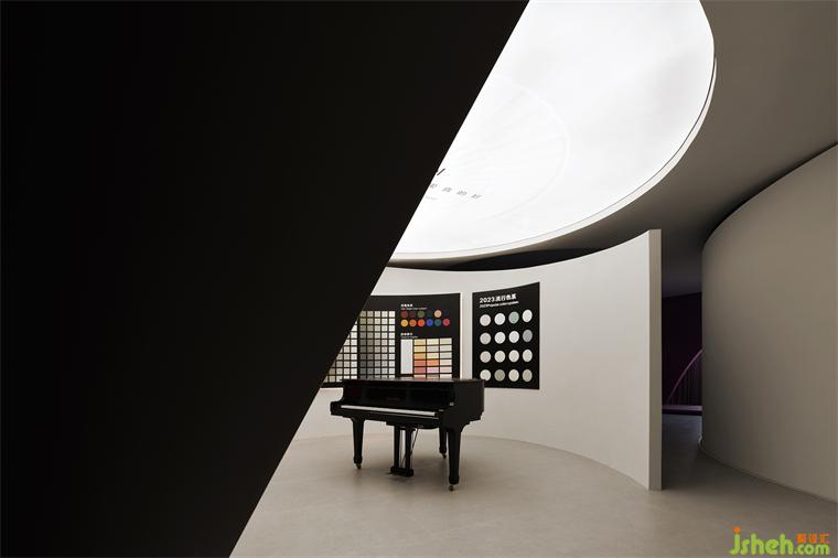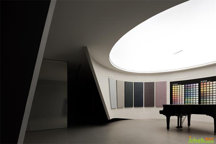在圓形選材區(qū)的核心位置,聳立著一臺氣質(zhì)高雅、裝飾華麗的鋼琴。它宛如一位音樂的守護者,散發(fā)出淡淡的木香。鋼琴的黑白鍵盤與周圍豐富多彩的色彩相互映襯,總部展廳設(shè)計共同演繹著音樂與色彩的交互魅力。