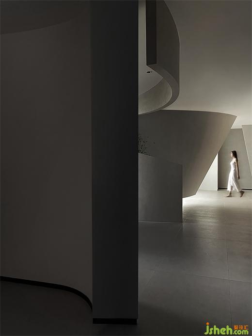 縱橫穿插的墻面和圓形天花由卡百利微水泥、微晶水泥、米蘭絲絨、布萊婭等藝術(shù)涂料裝點而成,它們以流動的姿態(tài),展現(xiàn)時間與空間的交織,猶如進入了一個超現(xiàn)實的當代藝術(shù)畫廊。