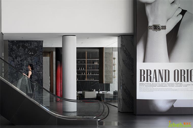 設(shè)計(jì)師將體塊疊加在形象背景墻上,多層次的體塊穿插關(guān)系,暗含力量的空間節(jié)奏和秩序,也成為了空間場域的記憶線索。精致的絲印藝術(shù)玻璃背景墻以及藍(lán)色奢石的接待臺(tái),都凸顯出品牌既時(shí)尚又雅奢的品牌定位,深灰色的啞光質(zhì)感產(chǎn)品和白色的大理石作為主調(diào),使空間沉穩(wěn)而不失優(yōu)雅。