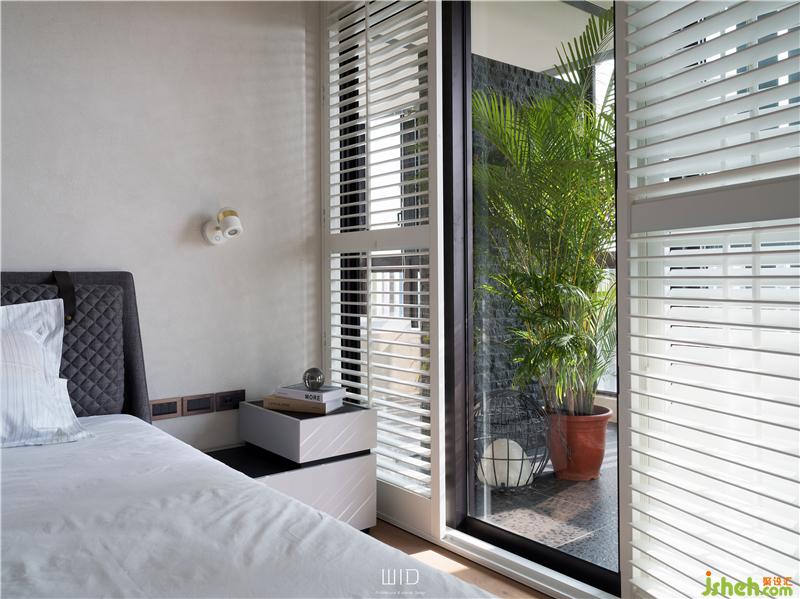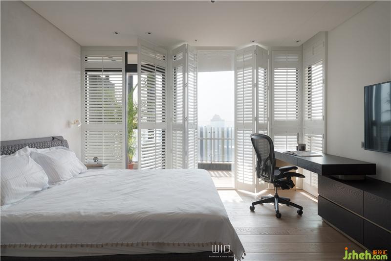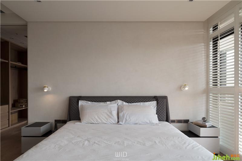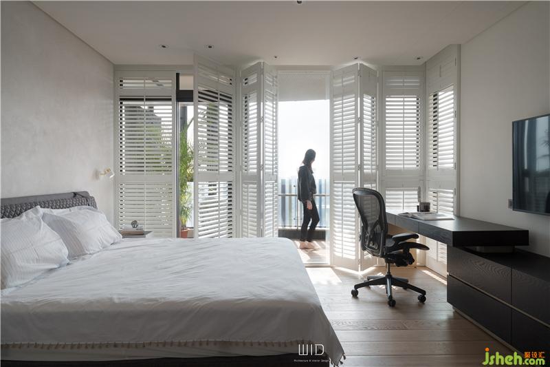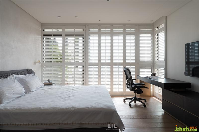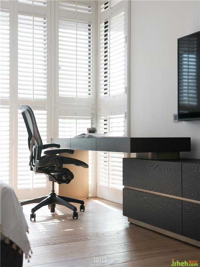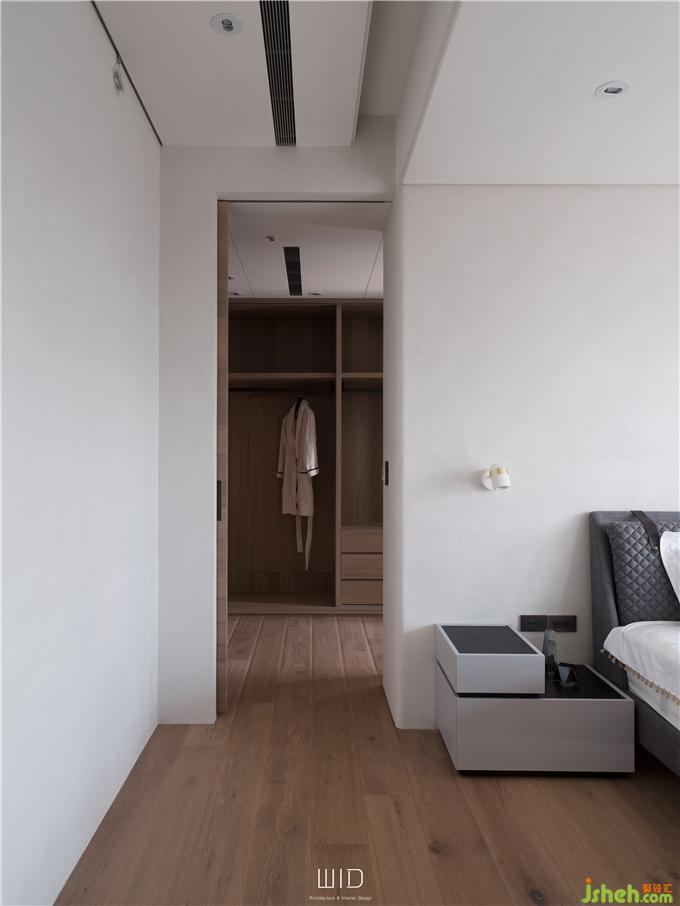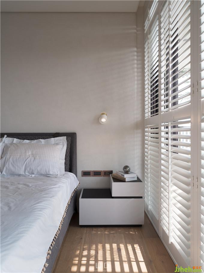 隨手拿本好書搭配著手沖咖啡,到戶外曬曬太陽,都是生活日常。我們使用了百葉窗,天氣好的時候可以全部收折起來,讓室內(nèi)室外合而為一,將窗戶關(guān)上,也一樣有著落地窗的采光與穿透。延伸「白色系」的百葉,將舒適的感覺帶進(jìn)臥室搭配窗外的景和植物,愜意又放松。主臥陽臺聯(lián)通客廳,在空間中可以隨性的走動、停留,場域之間沒有隔閡。面長的書桌結(jié)合收納功能,運(yùn)用高低落差增加層次感,木質(zhì)的顏色內(nèi)斂沉穩(wěn),可以安定人心。觸摸墻面各個角度的弧度、質(zhì)感,在光影之間的輕微碰撞中傾聽清脆悅耳的聲響,跟著線條一起走進(jìn)了更衣室。