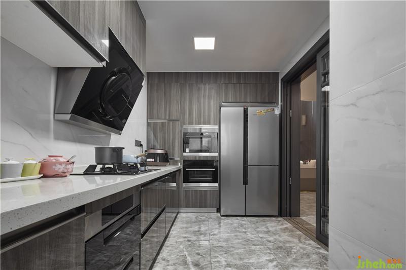 櫥柜與白色墻面在狹長(zhǎng)的空間中呈現(xiàn)出層次感,陽(yáng)光順著窗戶慢慢滲入,將空間照亮?;遗c白、虛與實(shí)、抽象與具象,空間營(yíng)造靜謐而深遠(yuǎn)的觀感,身臨其境享受烹飪中帶來(lái)的樂趣。