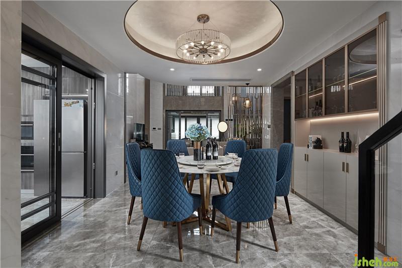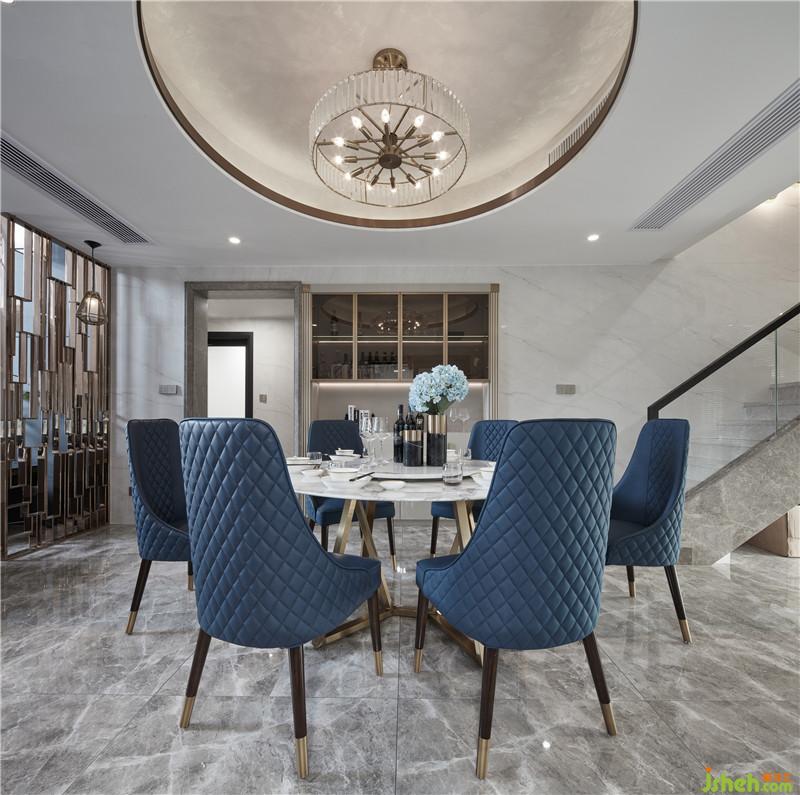 用餐區(qū)圓形天花與爵士白大理石圓桌形成上下呼應(yīng),鮮艷的藍(lán)色座椅帶來(lái)強(qiáng)烈的沖突感,為空間注入新的活力,營(yíng)造輕松歡快的氛圍。室內(nèi)設(shè)計(jì)