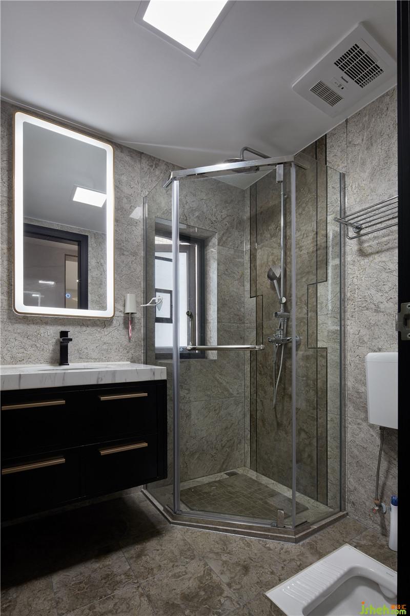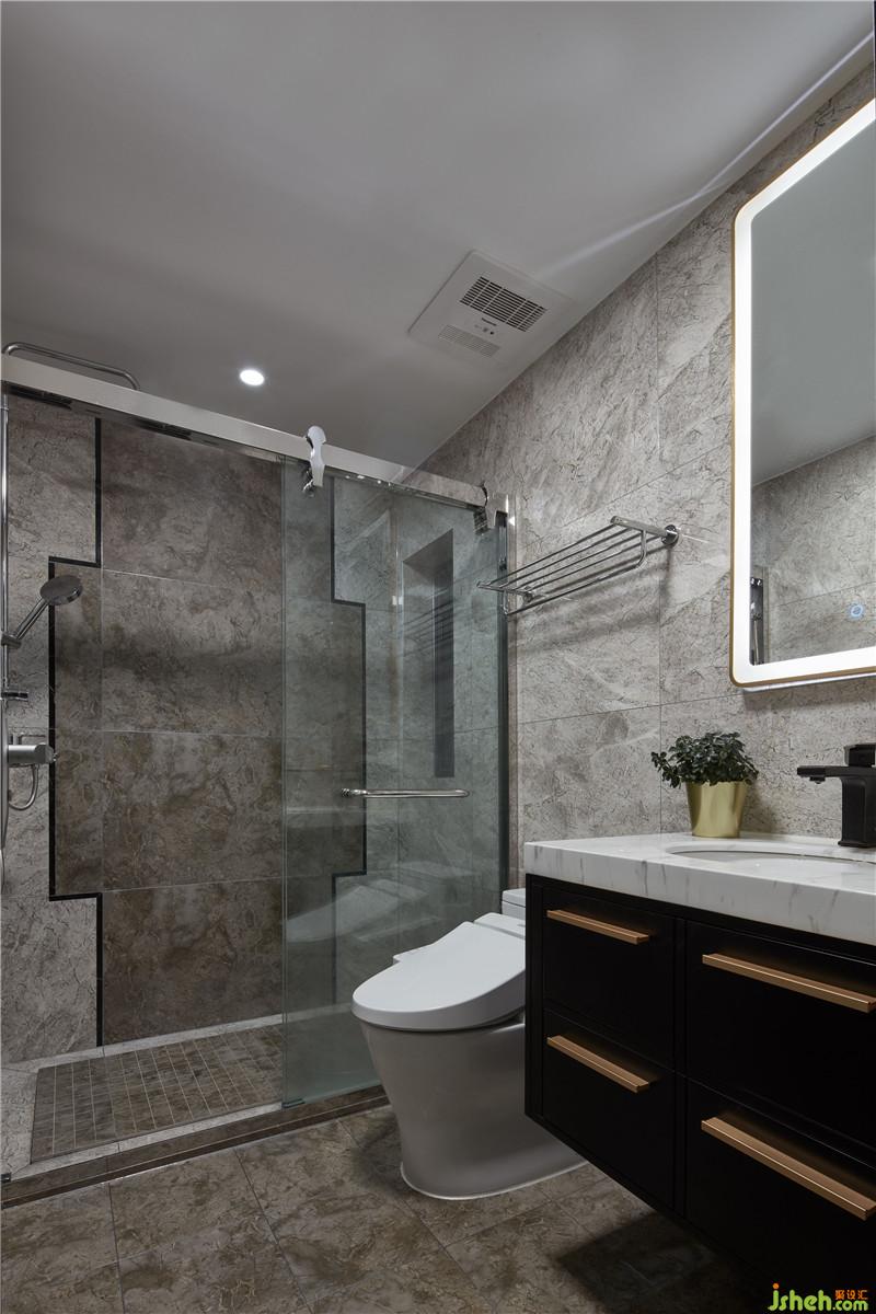 衛(wèi)生間以簡(jiǎn)潔的灰色大理石瓷磚搭配,整潔舒適,黑色的浴室柜點(diǎn)綴其中,于現(xiàn)代極簡(jiǎn)主義中流露出寫意之美,簡(jiǎn)雅而素淡。