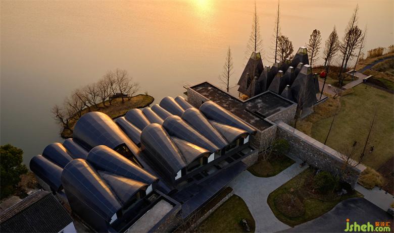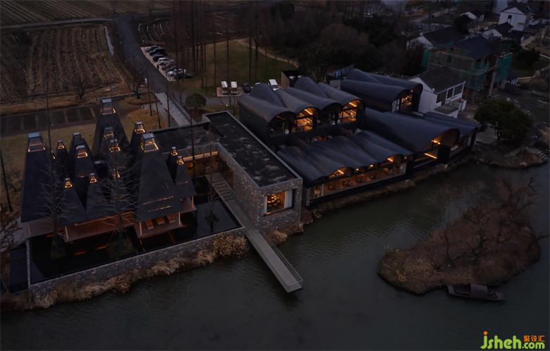 在蘇州吳江區(qū)的善灣村,田園村落的寧謐、河水的幽幽寬廣與歷史文脈相融。船塢酒店便坐落于這悠揚(yáng)空間的風(fēng)景之中。波紋般起伏的黑屋頂建筑群落,猶如聚集起來??堪哆叺臑跖翊?,時(shí)而婉轉(zhuǎn)悠揚(yáng),時(shí)而寧?kù)o動(dòng)人,成為岸邊水墨畫卷的點(diǎn)睛之筆。