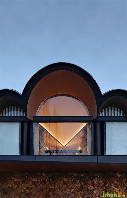 一方浮島,枯木幾棵,恣意伸展之間如同迎接,細(xì)述著時(shí)間的過往。酒店建筑與周遭的自然景觀融為一體。酒店設(shè)計(jì)高低錯(cuò)落的圓拱形屋頂形成聚落,如同山峰迭起的水岸邊??康乃宜掖?。
